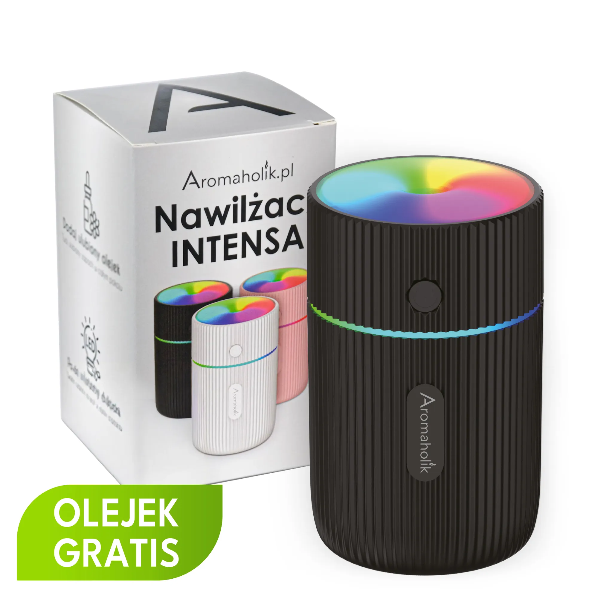 - Podświetlenie LED – dyfuzor zapachowy posiada 3 tryby LED, dzięki którym