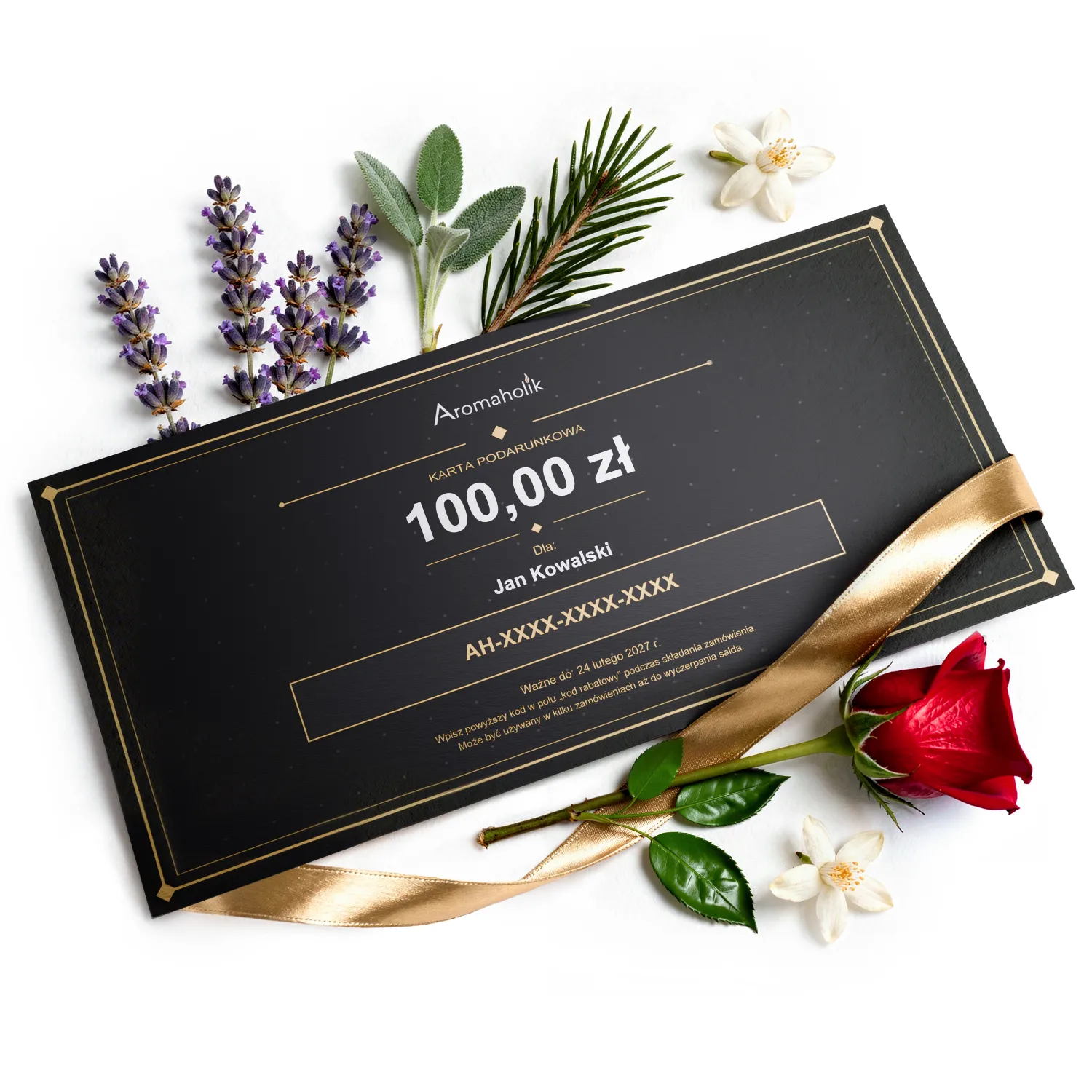 • Długa ważność – Karta podarunkowa Aromaholik jest ważna przez rok od daty zakupu. Obdarowana osoba ma mnóstwo czasu, by w spokoju wybrać wymarzone produkty.