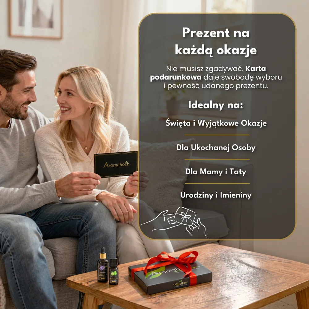 🎂 Urodziny – Podaruj bliskiej osobie zapach, który zapamięta na długo. Karta podarunkowa Aromaholik to oryginalny prezent urodzinowy dla miłośnika naturalnych aromatów i aromaterapii.