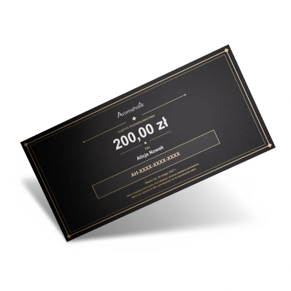 Nie wiesz, co podarować bliskiej osobie? Postaw na pewność i styl! Karta podarunkowa Aromaholik to perfekcyjny wybór dla tych, którzy kochają wyjątkowe zapachy lub dopiero zaczynają swoją przygodę z aromaterapią. Pozwól obdarowanej osobie samodzielnie wybrać wymarzony zapach spośród naszej bogatej kolekcji olejków eterycznych. Wystarczy wybrać kwotę, a voucher w formie elektronicznej zostanie wysłany bezpośrednio na wskazany adres e-mail – gotowy do wydrukowania lub przekazania w mgnieniu oka. Bo najlepszy prezent to ten, który pozwala wybrać dokładnie to, czego się pragnie.