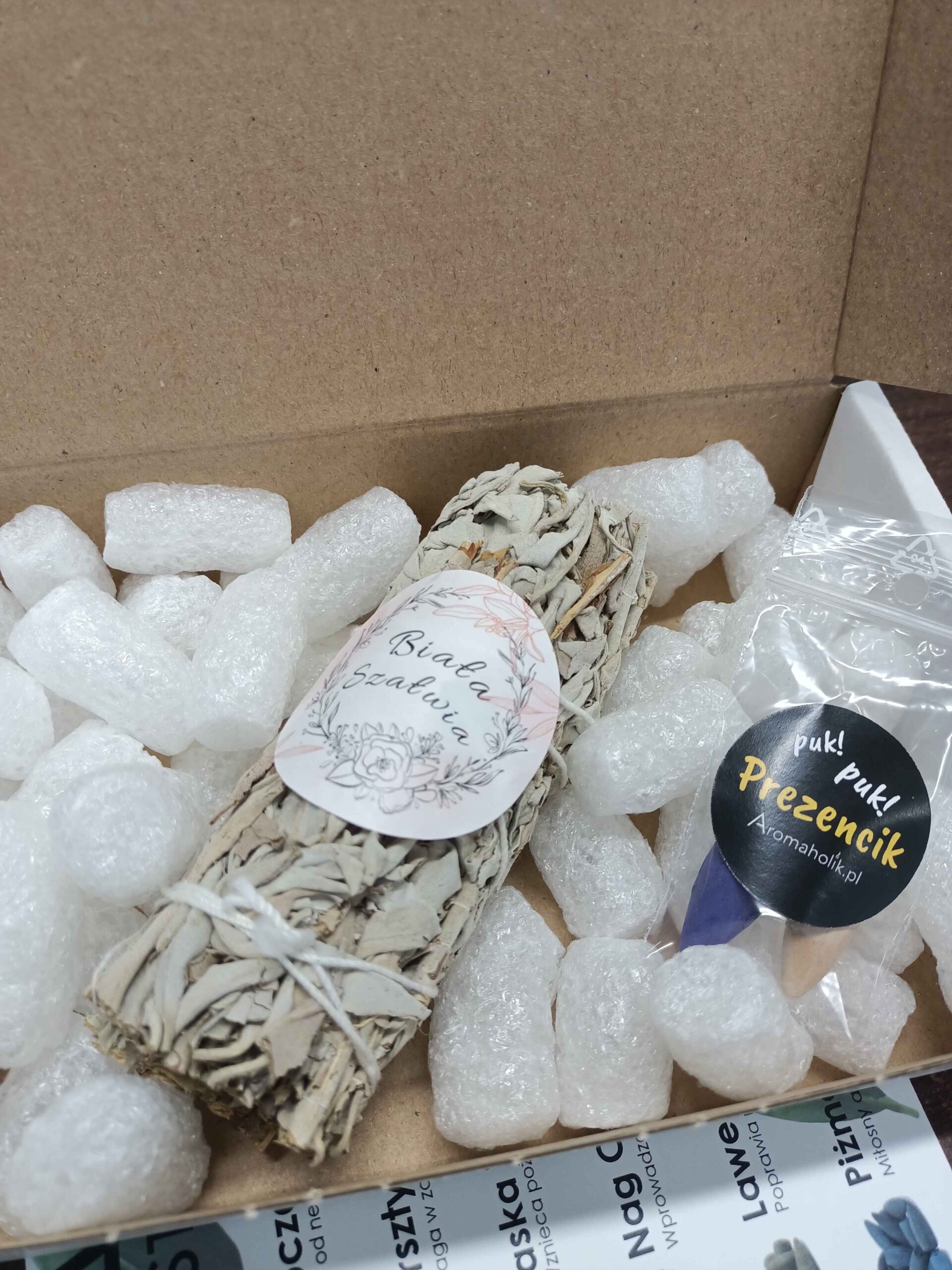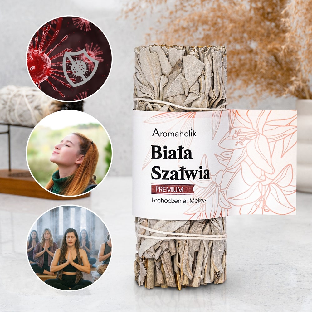 Biała szałwia posiada piękny i mistyczny zapach, który sprzyja skupieniu i koncentracji, sprawdza się również doskonale jako naturalny odświeżacz powietrza. Działa zbawiennie na stres, idealnie sprawdza się do medytacji, jogi czy pracy oddechem. Według osób praktykujących regularnie ten rytuał, oczyszczanie pomieszczeń białą szałwią pozwala przede wszystkim na zniwelowanie stresu. Pobudza funkcje umysłowe, mając przy tym łagodzący wpływ na depresję, uwalnia od ciężkiej energii, a także łagodzi stany niepokoju i przygnębienia. Szałwię należy stosować jako kadzidło, wystarczy podpalić i ugasić by się tliła oraz pozostawić w ognioodpornym naczyniu.