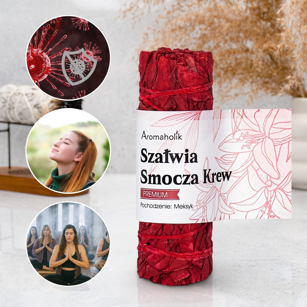 Szałwia Smocza Krew to nic innego jak szałwia powlekana żywicą smoczego drzewa, które posiada naturalny czerwony pigment oraz piękny, słodki i magiczny zapach. Jej działanie sprzyja skupieniu i koncentracji, sprawdza się również doskonale jako naturalny odświeżacz powietrza. Szałwię należy stosować jako kadzidło, wystarczy podpalić i ugasić by się tliła oraz pozostawić w ognioodpornym naczyniu. Działa zbawiennie na stres, idealnie sprawdza się do medytacji, jogi czy pracy oddechem. Krew smoka reprezentuje miłość, ochronę i siłę, jest to zatem mocny zapach, który może wyrwać Cię z codziennego życia.