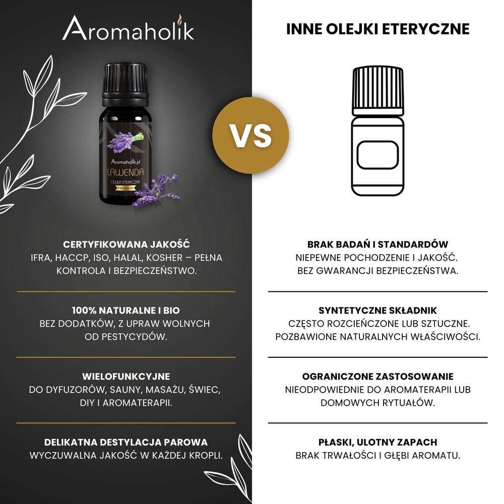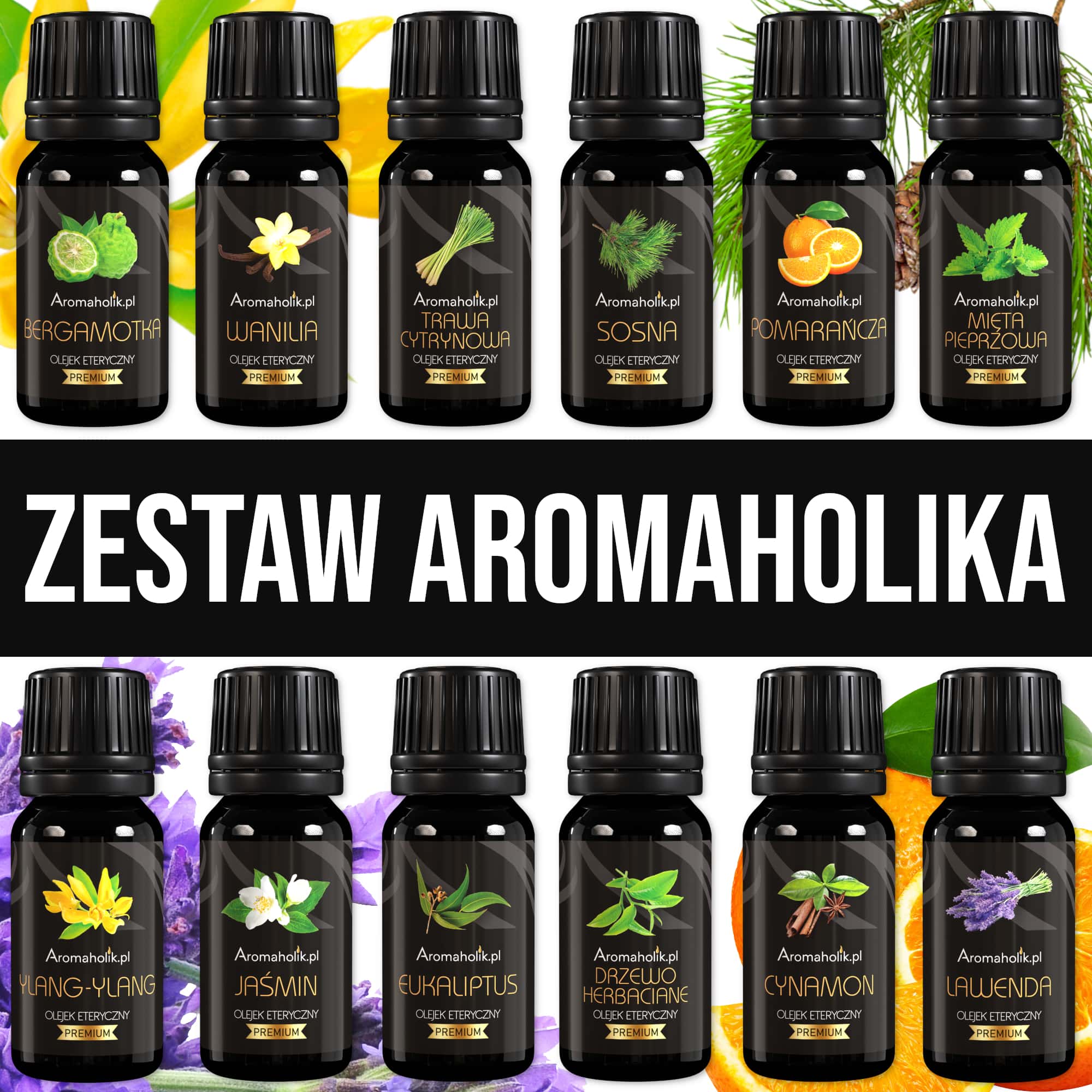 Zestaw Aromaholika to wyjątkowa kolekcja 12 najbardziej uwielbianych zapachów z naszej oferty, które oczarują Cię swoimi właściwościami i dobroczynnym wpływem na samopoczucie. Kwiatowe aromaty, takie jak jaśmin, lawenda i ylang-ylang, otulą Twoje zmysły delikatnością i wprowadzą w stan błogiego relaksu. Leśne zapachy sosny i drzewa herbacianego wesprą drogi oddechowe i wprowadzą harmonię do Twojego dnia. Cytrusowe nuty pomarańczy, bergamotki i trawy cytrynowej dodadzą energii i skutecznie pobudzą do działania. Miętowy i eukaliptusowy olejek zapewnią orzeźwiające uczucie chłodu, natomiast cynamon i wanilia otulą Cię ciepłem i przytulnością, idealne na chłodne wieczory.