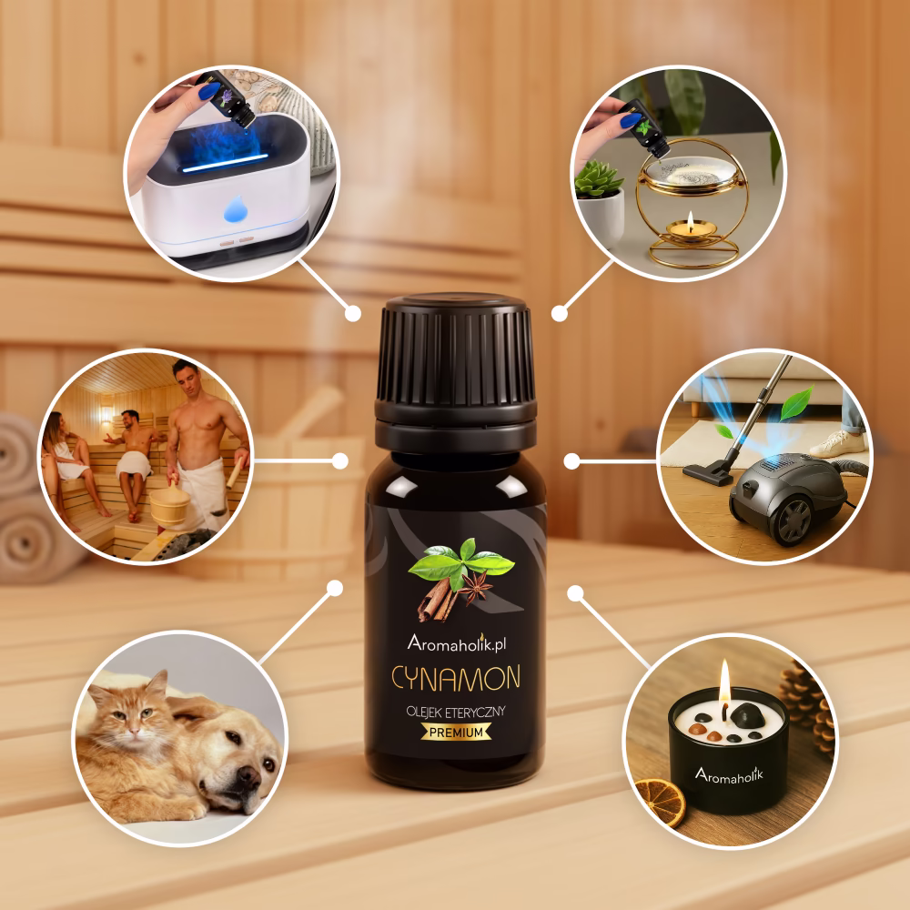 Olejek Cynamonowy to produkt niezwykle wszechstronny – możesz stosować go w różnych formach, dopasowując do swoich potrzeb. Świetnie sprawdzi się w nawilżaczu powietrza, dyfuzorze lub kominku zapachowym, tworząc przytulną atmosferę i wprowadzając wyjątkowy zapach. Można dodać go do świec, wosków zapachowych, sprayów do pomieszczeń czy zawieszek (np. do szafy lub auta). Olejek Cynamonowy świetnie sprawdza się w saunie lub przy codziennych obowiązkach – do prania czy odkurzacza. To prosty sposób na naturalne odświeżenie swojej przestrzeni.