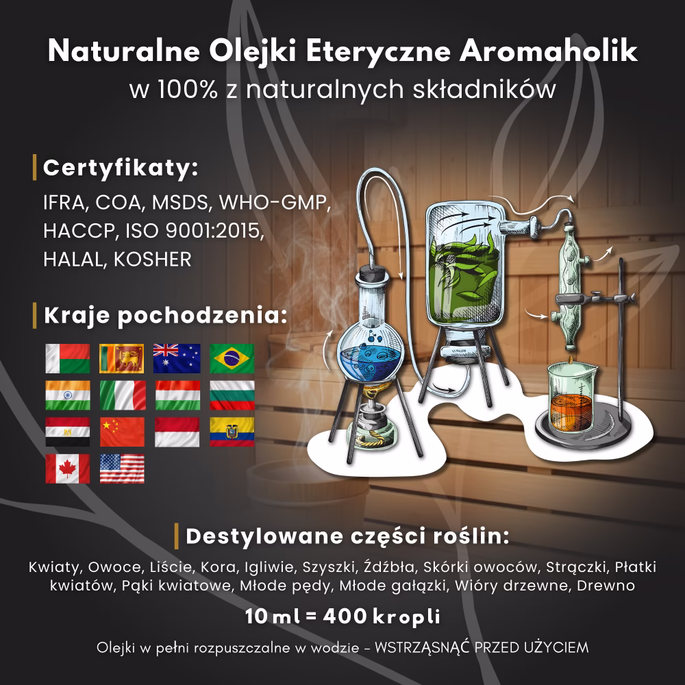 Olejki Aromaholik są pozyskiwane z naturalnych składników* drogą destylacji starannie wyselekcjonowanych liści Eukaliptusa Gałkowego z Indii – a nie drogą syntetyczną, jak większość olejków zapachowych. Posiadają wysoką koncentrację (50% większa niż standardowy olejek) oraz są w pełni rozpuszczalne w wodzie.
