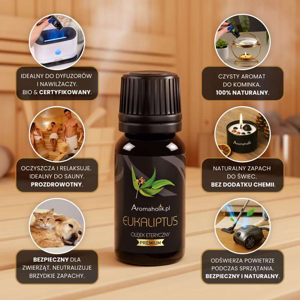 Olejek Eukaliptusowy to produkt niezwykle wszechstronny – możesz stosować go w różnych formach, dopasowując do swoich potrzeb. Świetnie sprawdzi się w nawilżaczu powietrza, dyfuzorze lub kominku zapachowym, tworząc przytulną atmosferę i wprowadzając wyjątkowy zapach. Można dodać go do świec, wosków zapachowych, sprayów do pomieszczeń czy zawieszek (np. do szafy lub auta). Olejek Eukaliptusowy świetnie sprawdza się w saunie lub przy codziennych obowiązkach – do prania, zmywarki czy odkurzacza. To prosty sposób na naturalne odświeżenie swojej przestrzeni.