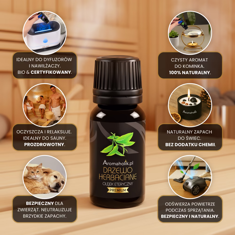Olejek z Drzewa Herbacianego to produkt niezwykle wszechstronny – możesz stosować go w różnych formach, dopasowując do swoich potrzeb. Świetnie sprawdzi się w nawilżaczu powietrza, dyfuzorze lub kominku zapachowym, tworząc przytulną atmosferę i wprowadzając wyjątkowy zapach. Można dodać go do świec, wosków zapachowych, sprayów do pomieszczeń czy zawieszek (np. do szafy lub auta). Naturalny Olejek z Drzewa Herbacianego świetnie sprawdza się w saunie lub przy codziennych obowiązkach – do prania, zmywarki czy odkurzacza. To prosty sposób na naturalne odświeżenie swojej przestrzeni.