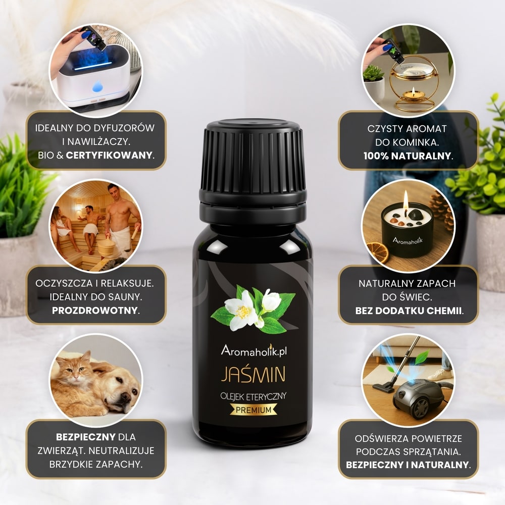 Olejek eteryczny jaśminowy to produkt niezwykle wszechstronny – możesz stosować go w różnych formach, dopasowując do swoich potrzeb. Świetnie sprawdzi się w nawilżaczu powietrza, dyfuzorze lub kominku zapachowym, tworząc przytulną atmosferę i wprowadzając wyjątkowy zapach. Można dodać go do świec, wosków zapachowych, sprayów do pomieszczeń czy zawieszek (np. do szafy lub auta). Olejek Jaśminowy świetnie sprawdza się w saunie lub przy codziennych obowiązkach – do prania czy odkurzacza. To prosty sposób na naturalne odświeżenie swojej przestrzeni.
