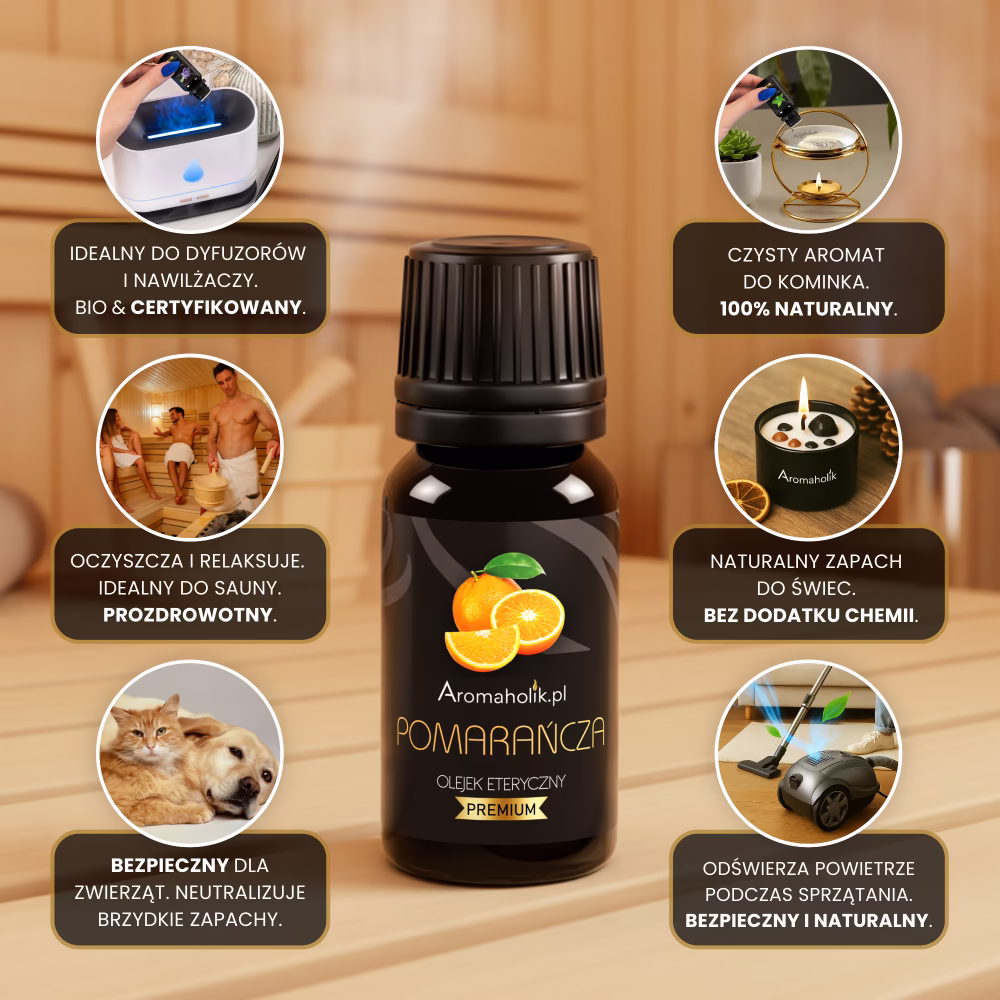 Olejek Pomarańczowy to produkt niezwykle wszechstronny – możesz stosować go w różnych formach, dopasowując do swoich potrzeb. Świetnie sprawdzi się w nawilżaczu powietrza, dyfuzorze lub kominku zapachowym, tworząc przytulną atmosferę i wprowadzając wyjątkowy zapach. Można dodać go do świec, wosków zapachowych, sprayów do pomieszczeń czy zawieszek (np. do szafy lub auta). Olejek Pomarańczowy świetnie sprawdza się w saunie lub przy codziennych obowiązkach – do prania, zmywarki czy odkurzacza. To prosty sposób na naturalne odświeżenie swojej przestrzeni.