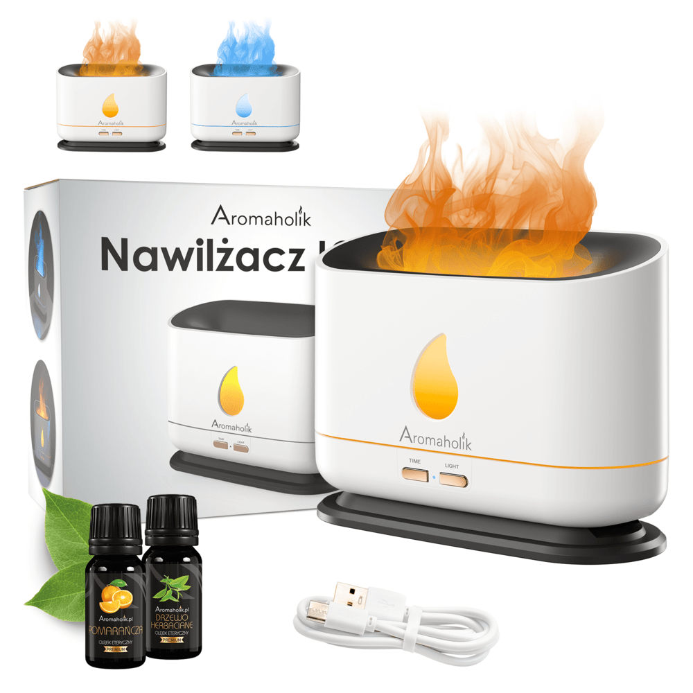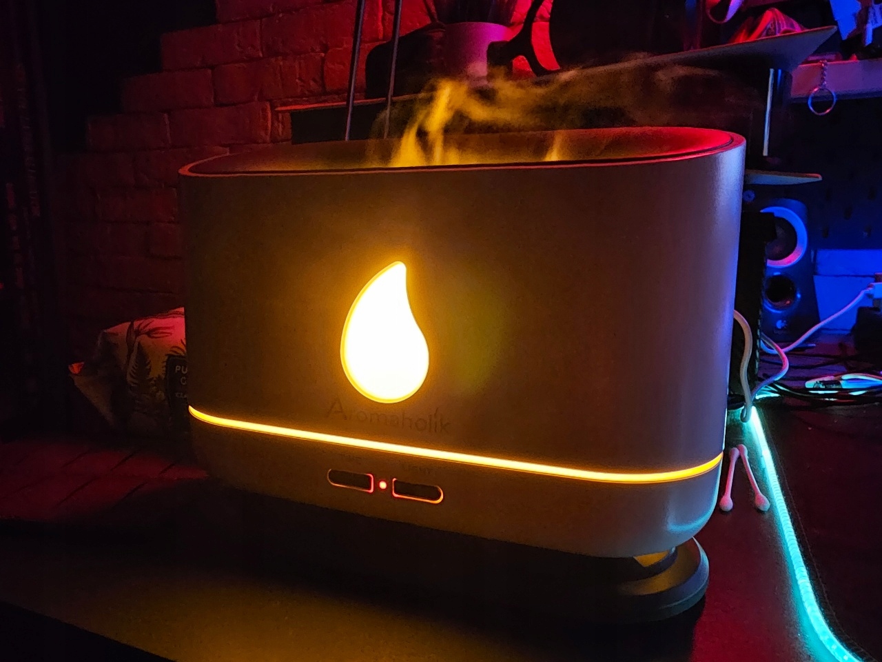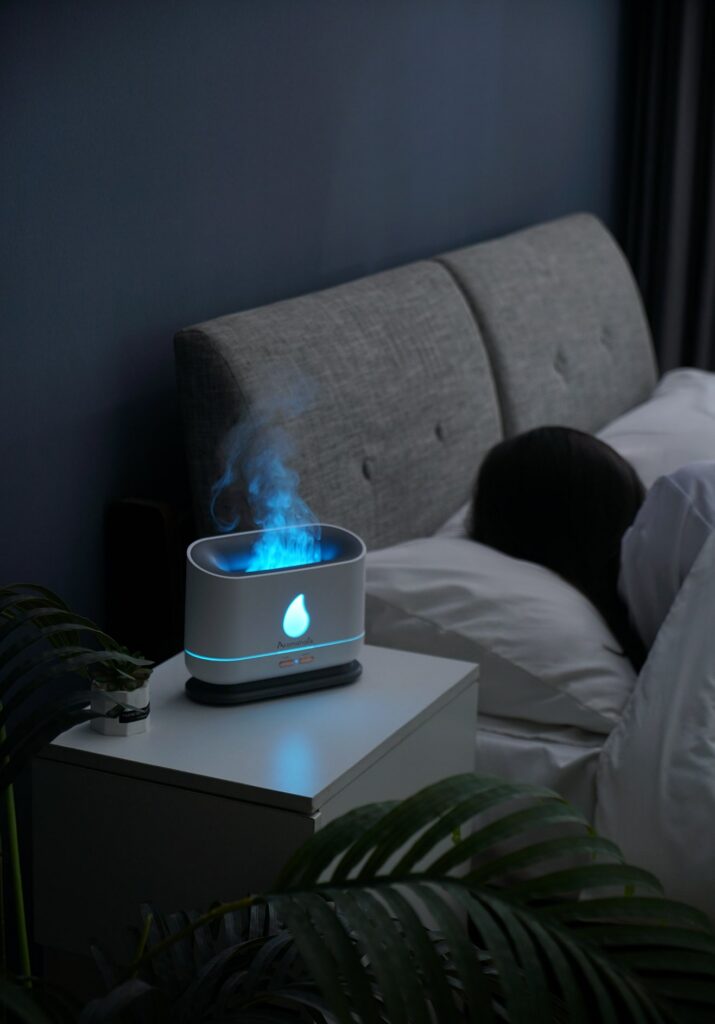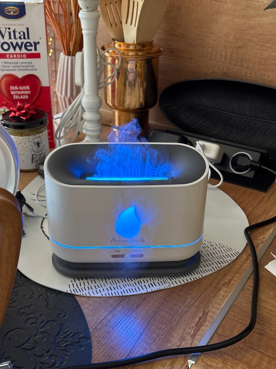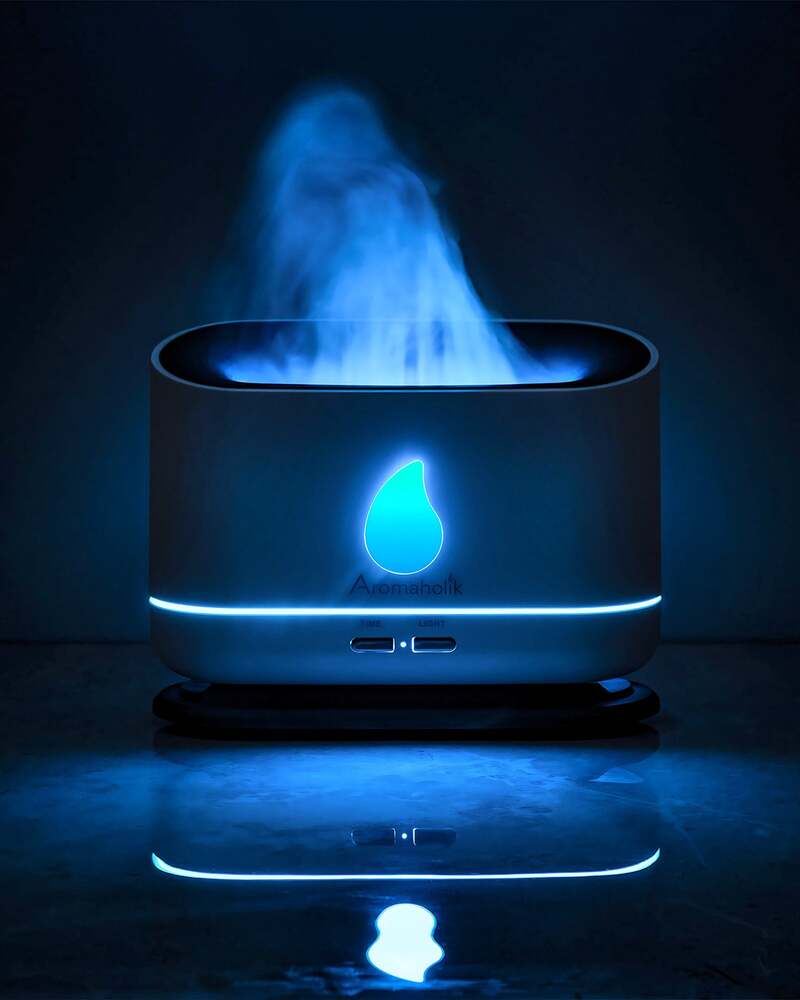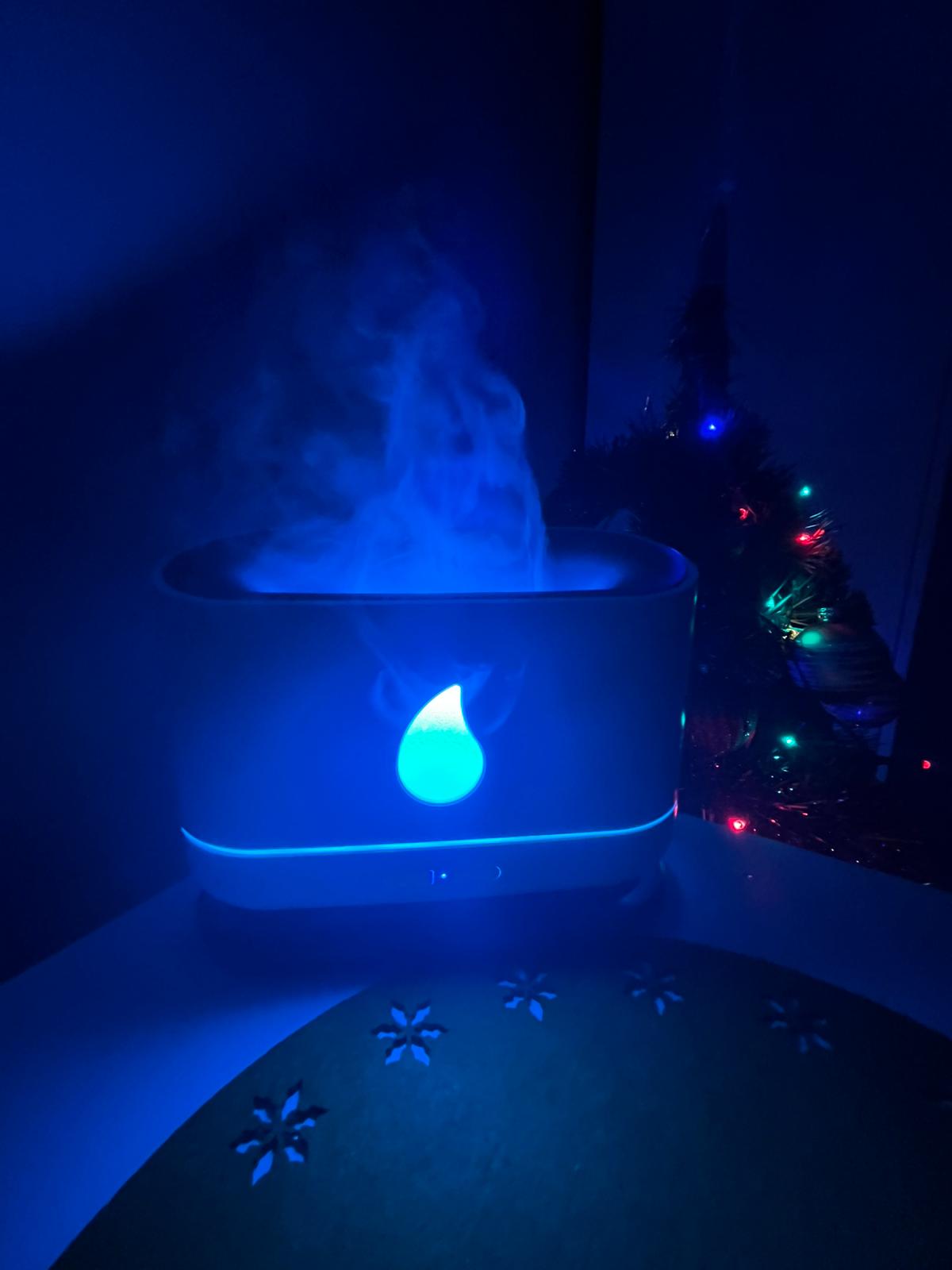 Nawilżacz powietrza emituje podświetlaną mgiełkę przypominającą ogień lub parujący lód — jest idealny na wieczory pełne relaksu i wizualnych wrażeń.