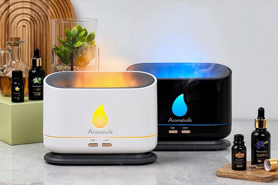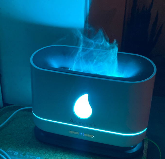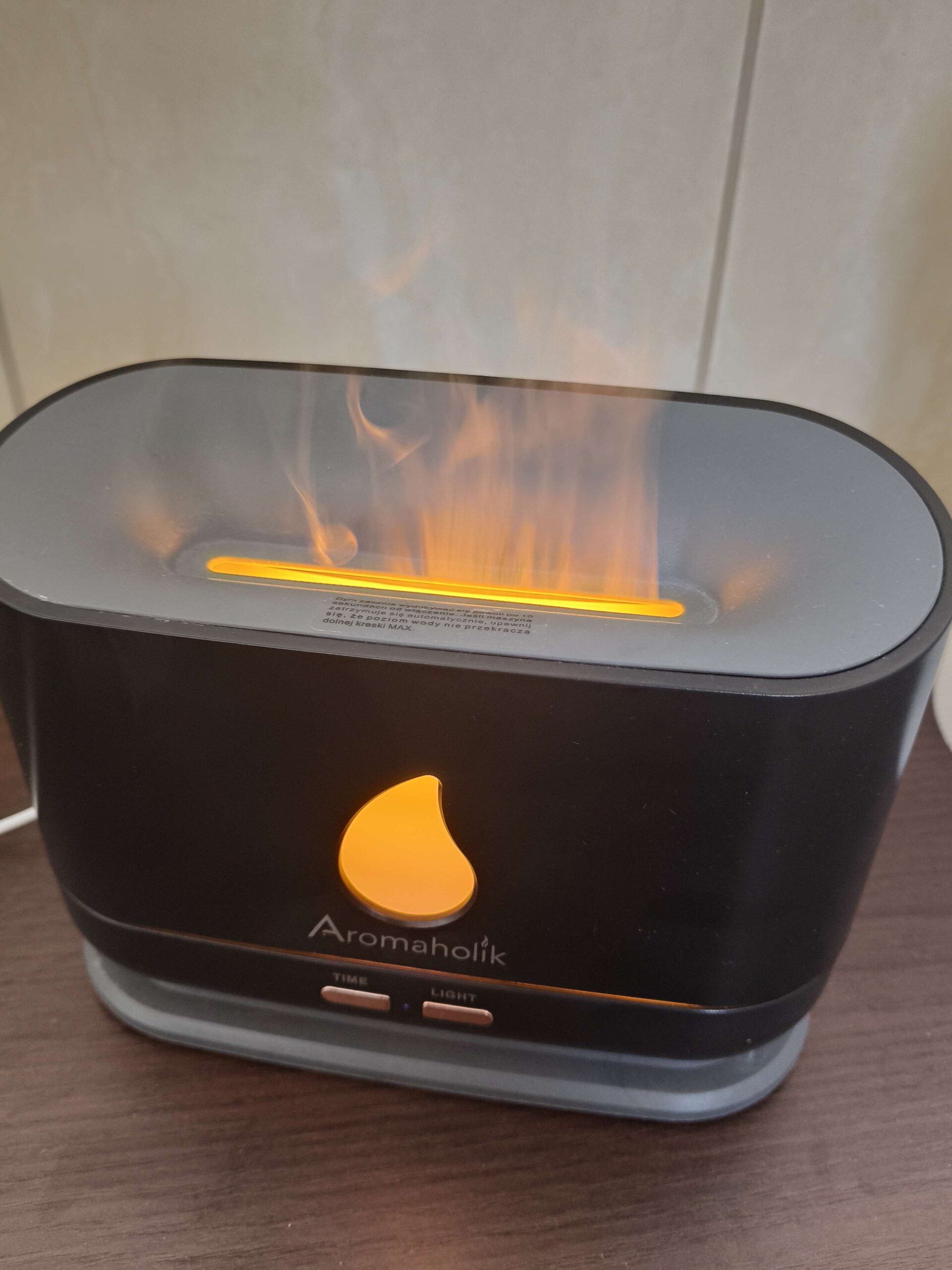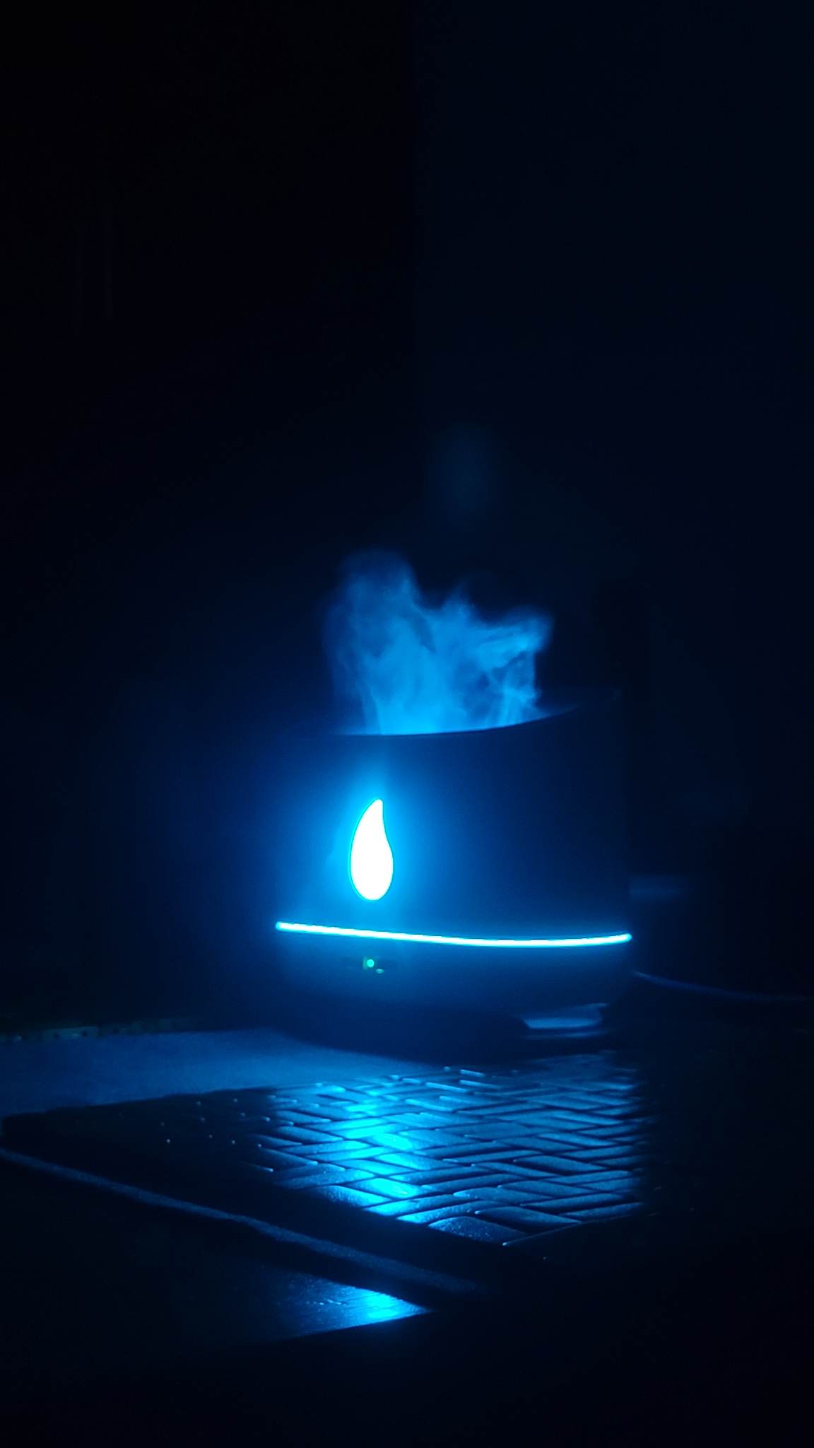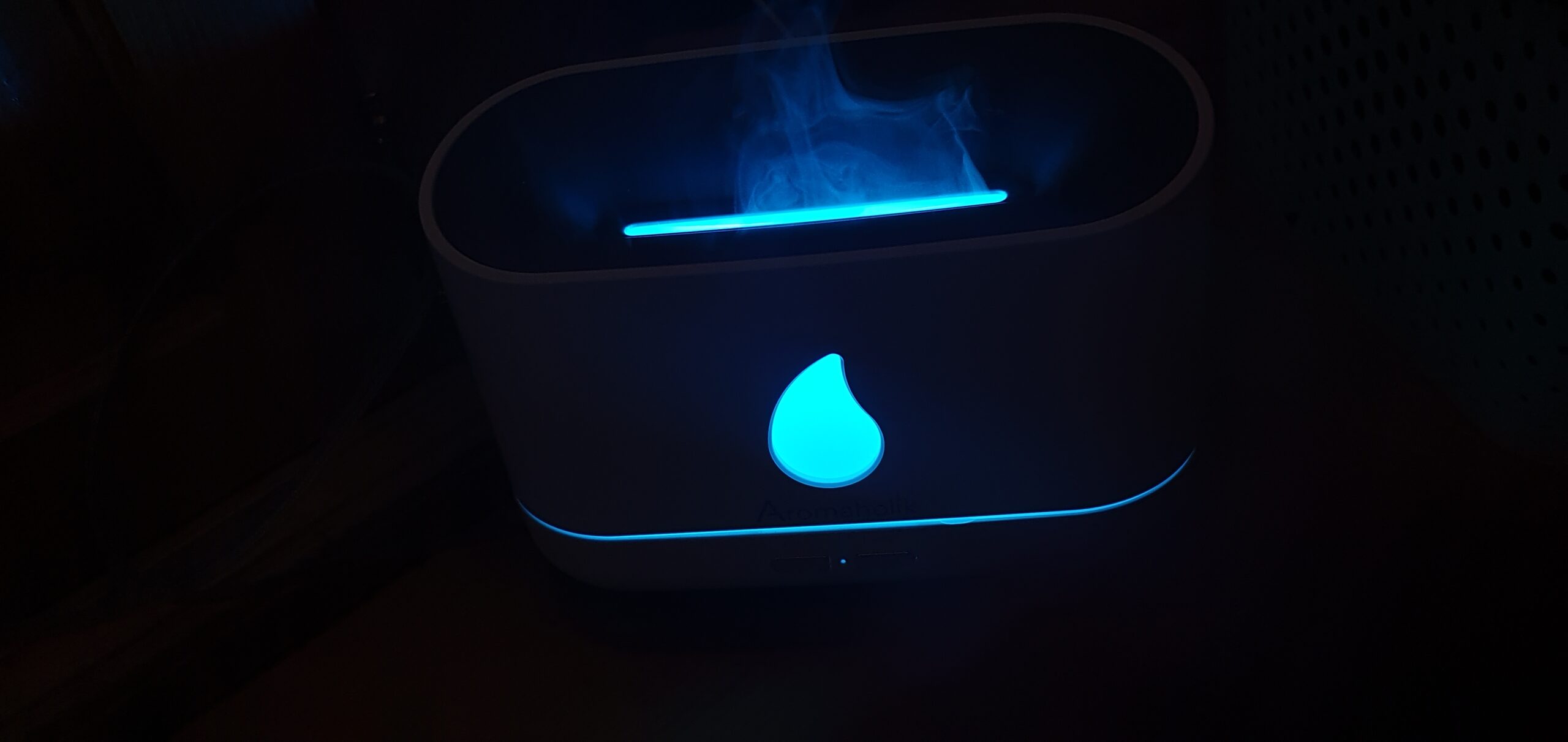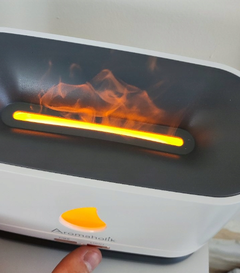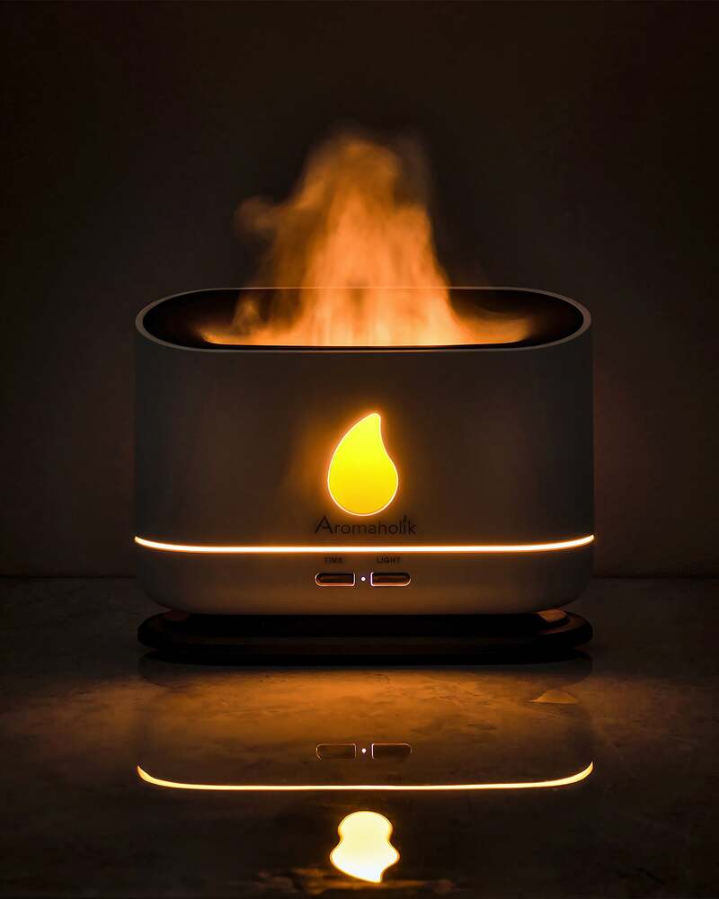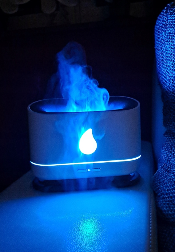 Nawilżacz powietrza emituje podświetlaną mgiełkę przypominającą ogień lub parujący lód — jest idealny na wieczory pełne relaksu i wizualnych wrażeń.