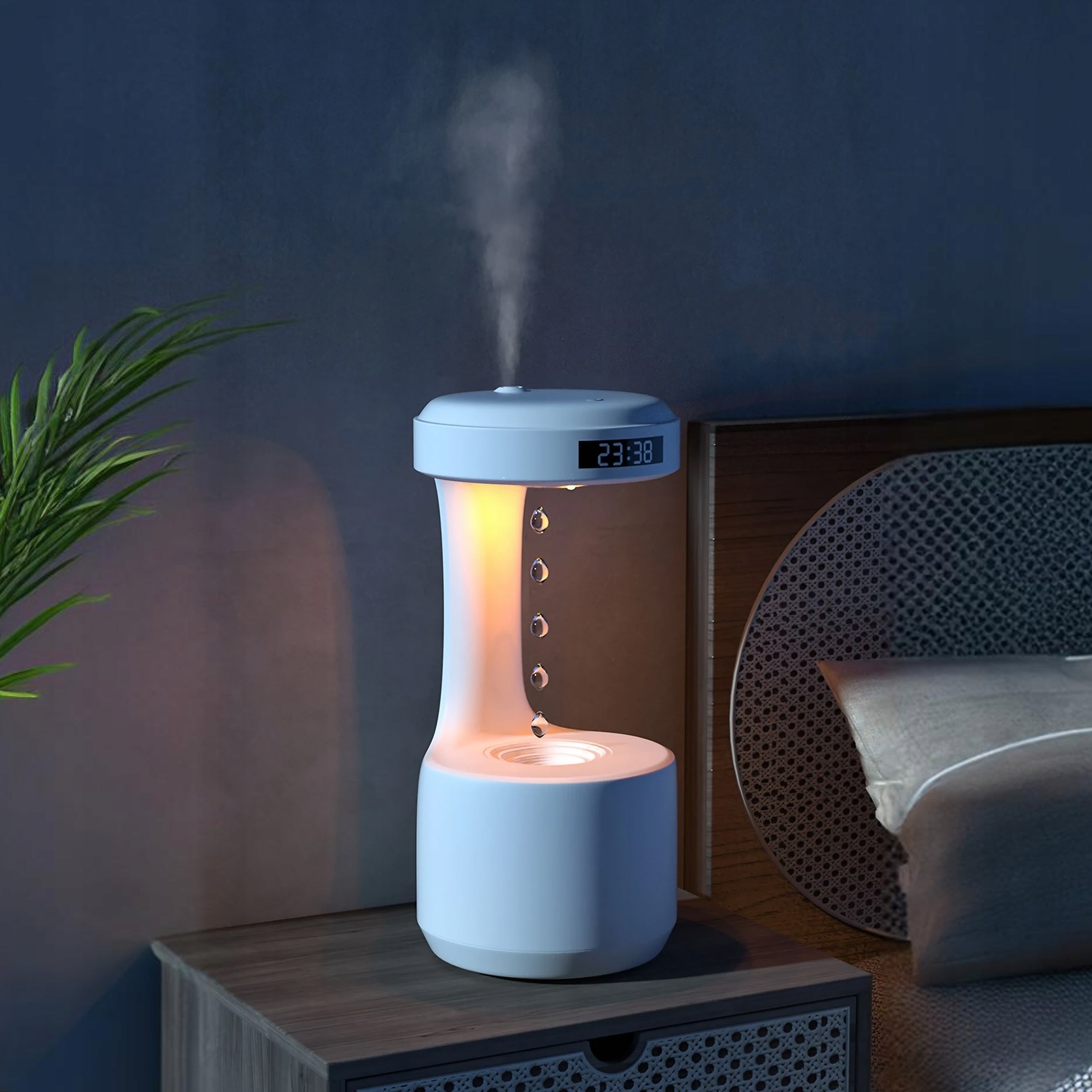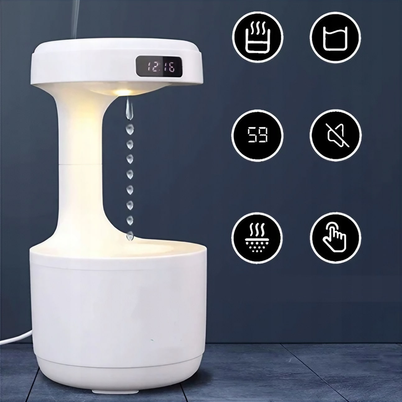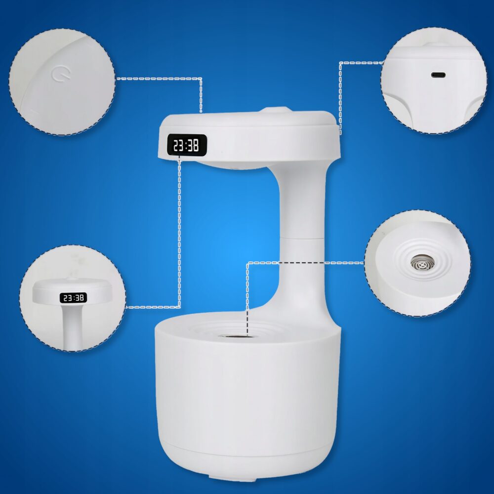 - Efekt Antygrawitacyjny -Efekt unoszącej się kropli wody, tworzący wrażenie zawieszenia w powietrzu, przyciąga wzrok i fascynuje, przekształcając codzienne nawilżanie w niezwykłe doświadczenie.