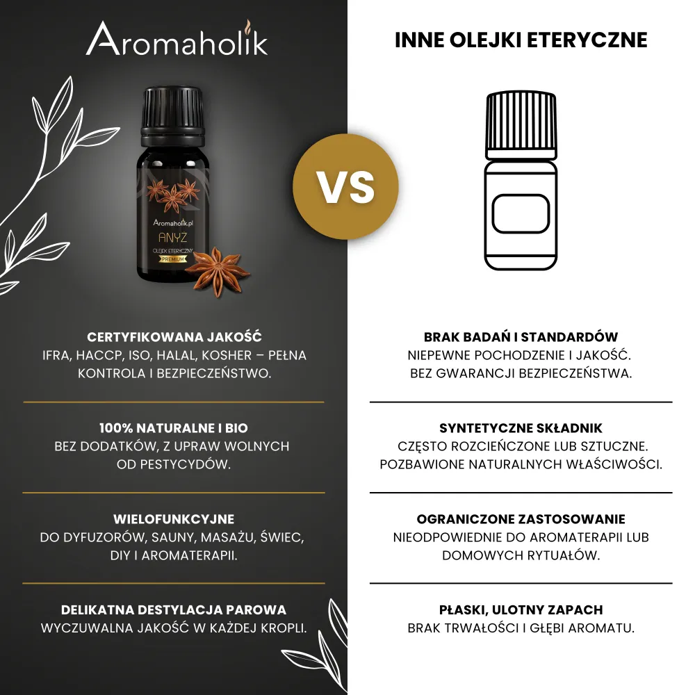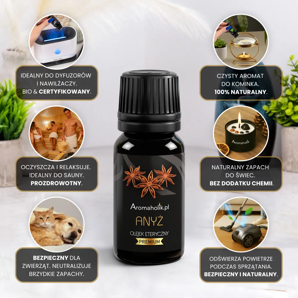 Olejek eteryczny z anyżu gwiazdkowego wyróżnia się intensywnie słodkim, wyraźnie anyżowym aromatem, który rozgrzewa i otula przestrzeń przyjemnym, korzennym charakterem. Jego zapach sprzyja wyciszeniu, pomaga „zmiękczyć” napięcie i stworzyć spokojną atmosferę, dlatego świetnie sprawdzi się wieczorem, w chłodne dni oraz podczas relaksu. Olejek anyżowy jest ceniony za właściwości odświeżające i wspierające komfort oddychania w aromaterapii oraz jako ciepły akcent zapachowy, który dodaje wnętrzu przytulności.