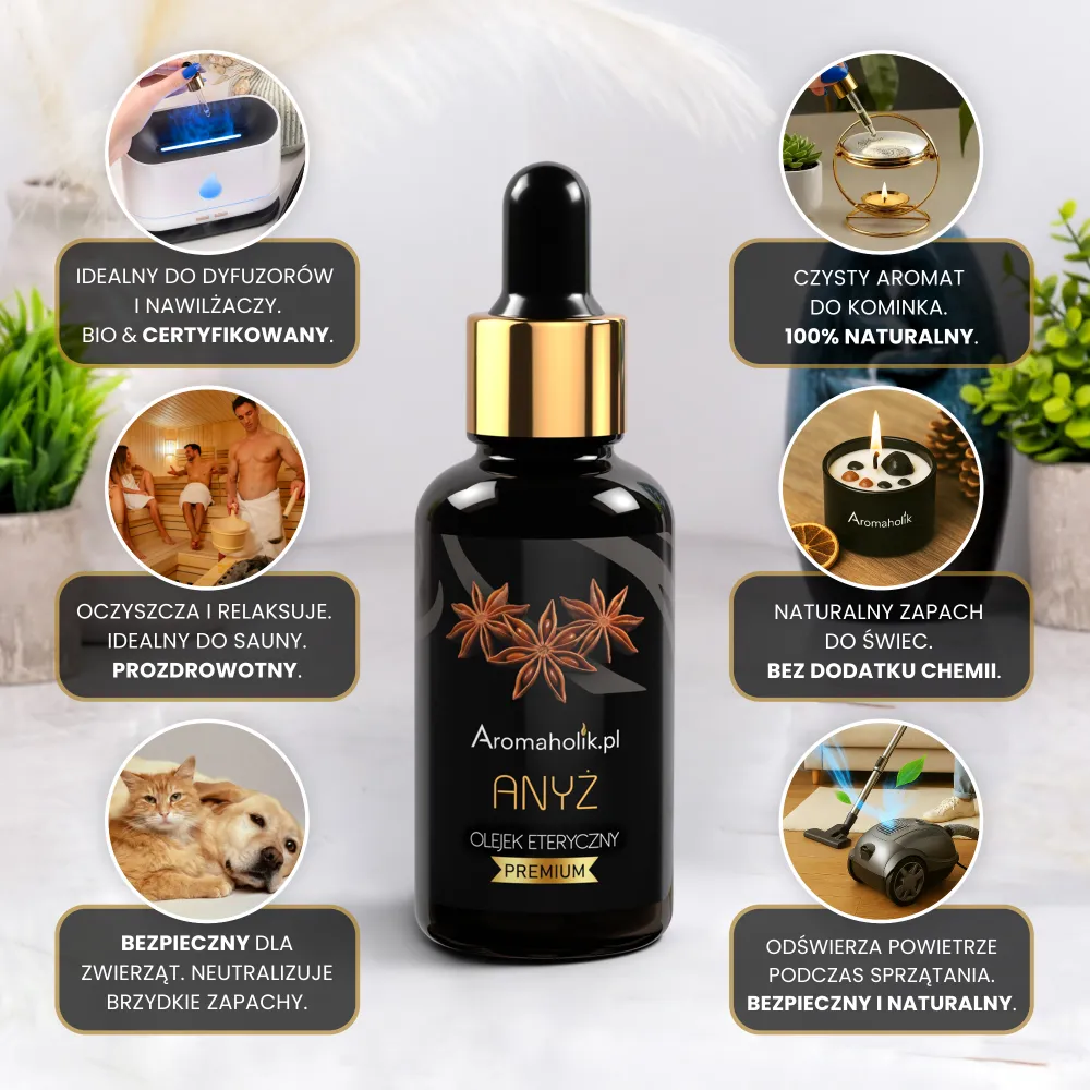 Olejek Anyżowy wprawi Cię w zachwycenie swoją głęboką, słodką nutą, która przywodzi na myśli ciepło domowego ogniska. Jego naturalna, korzenna woń posiada unikalne właściwości wyciszające i wspierające układ oddechowy. W trakcie jego stosowania doznasz uczucia ulgi i rozluźnienia, dlatego jest szczególny polecany osobom żyjącym w pośpiechu, zmagającym się z napięciem nerwowym. Ponadto olejek anyżowy działa oczyszczająco na powietrze, eliminując nieprzyjemne zapachy i wprowadzając do wnętrza aurę spokoju.