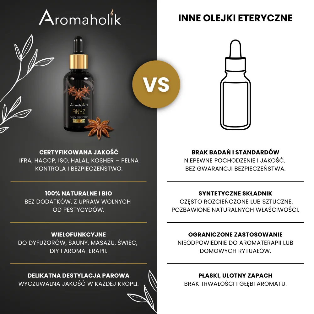 Olejki eteryczne Aromaholik są pozyskiwane z naturalnych składników* drogą destylacji starannie wyselekcjonowanego surowca Anyżu gwiazdkowego z Indii– a nie drogą syntetyczną, jak większość olejków zapachowych. Posiadają wysoką koncentrację (50% większa niż standardowy olejek) oraz są w pełni rozpuszczalne w wodzie.