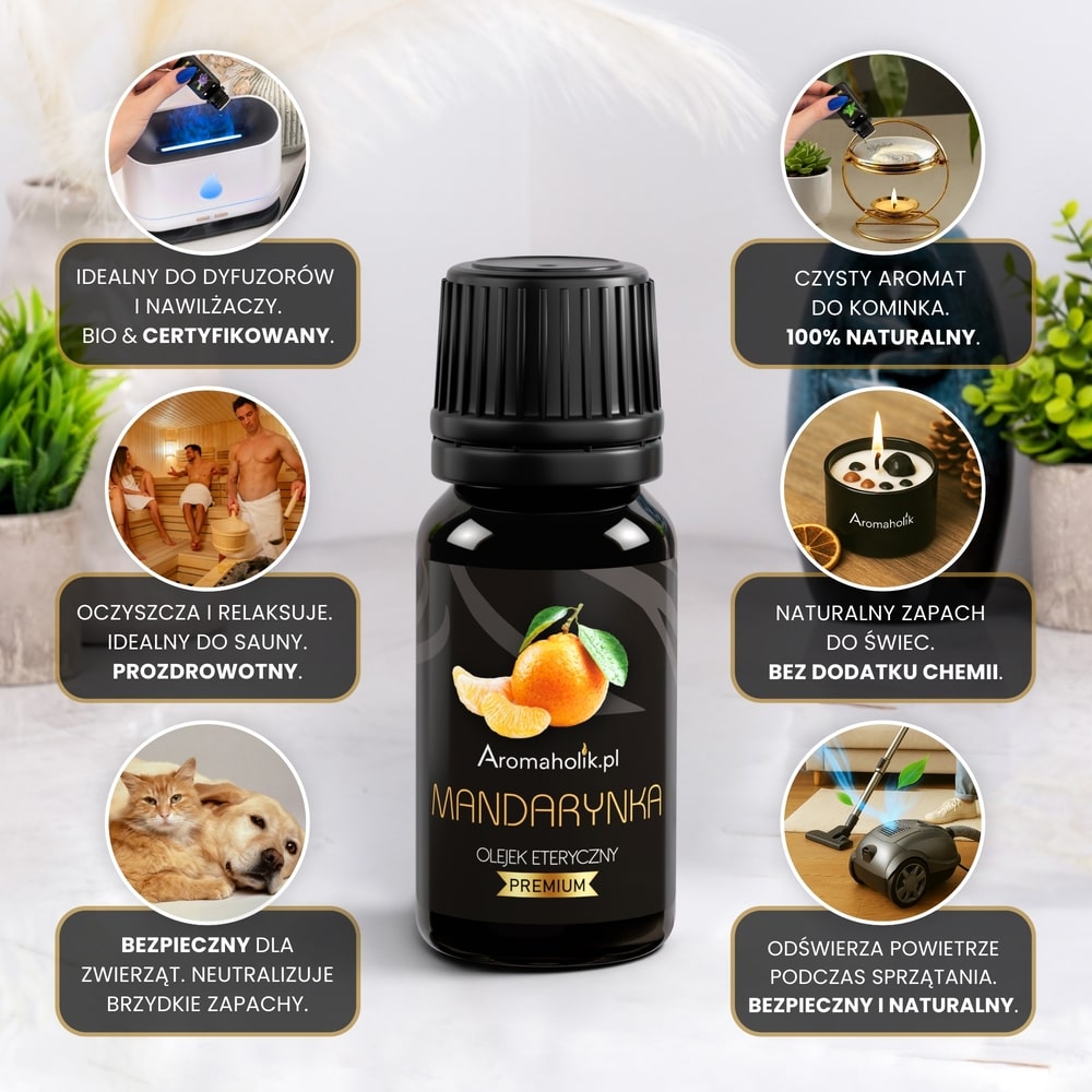 Olejek Mandarynkowy to produkt niezwykle wszechstronny – możesz stosować go w różnych formach, dopasowując do swoich potrzeb. Świetnie sprawdzi się w nawilżaczu powietrza, dyfuzorze lub kominku zapachowym, tworząc przytulną atmosferę i wprowadzając wyjątkowy zapach. Można dodać go do świec, wosków zapachowych, sprayów do pomieszczeń czy zawieszek (np. do szafy lub auta). Olejek Mandarynkowy świetnie sprawdza się w saunie lub przy codziennych obowiązkach – do prania, zmywarki czy odkurzacza. To prosty sposób na naturalne odświeżenie swojej przestrzeni.