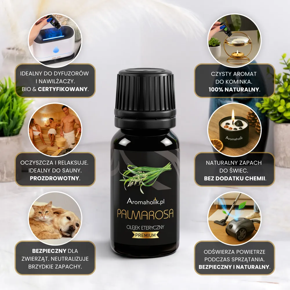Olejek eteryczny Palmarosa ma charakterystyczny, trawiasto-kwiatowy aromat, który wprowadza świeżość, a jednocześnie przyjemnie uspokaja. Jego zapach pomaga wyciszyć napięcie, uporządkować myśli i stworzyć komfortową atmosferę, dlatego świetnie sprawdzi się wieczorem, podczas relaksu oraz przed snem. Palmarosa jest ceniona w aromaterapii za działanie kojące i wspierające dobre samopoczucie – buduje lekki, czysty klimat bez ciężkich nut.