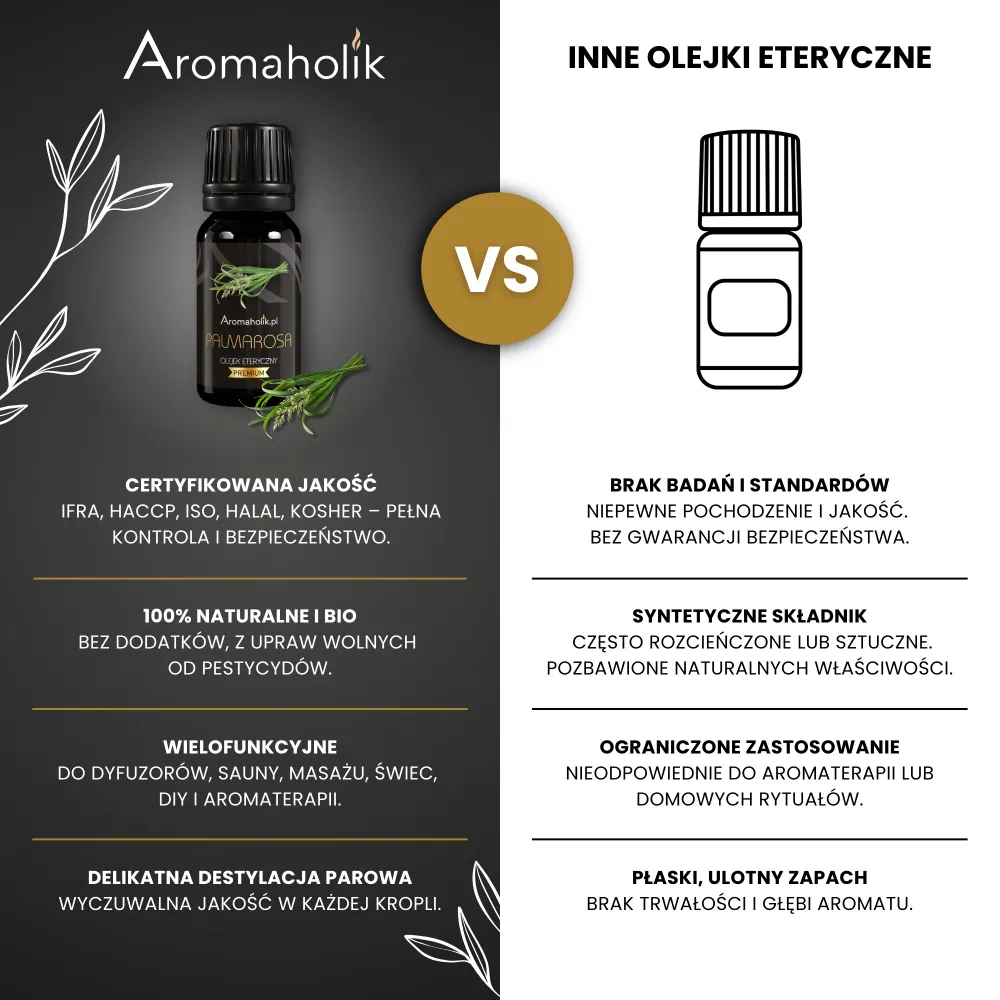 Olejki Aromaholik są pozyskiwane z naturalnych składników* drogą destylacji parą wodną starannie wyselekcjonowanej trawy Palmarosy (Cymbopogon martini) – a nie drogą syntetyczną, jak większość olejków zapachowych. Posiadają wysoką koncentrację (50% większa niż standardowy olejek) oraz są w pełni rozpuszczalne w wodzie.