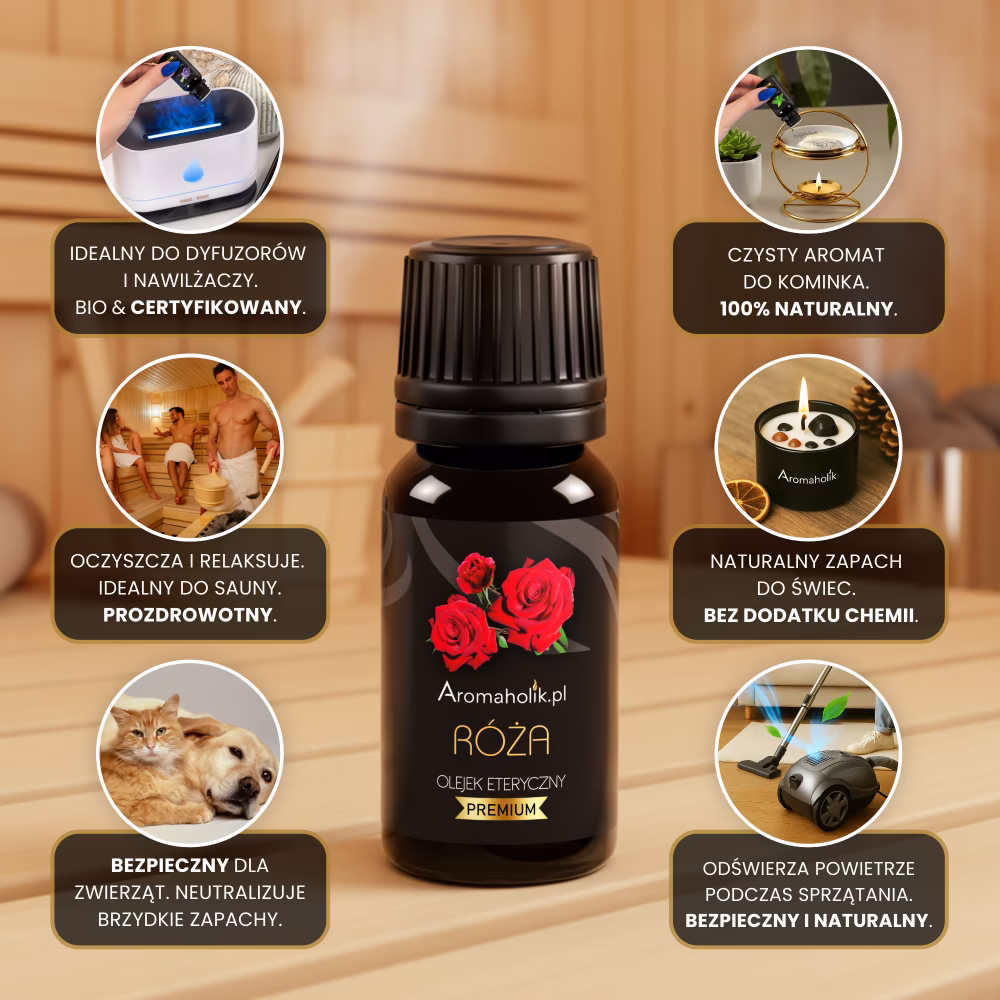 Olejek Różany to produkt niezwykle wszechstronny – możesz stosować go w różnych formach, dopasowując do swoich potrzeb. Świetnie sprawdzi się w nawilżaczu powietrza, dyfuzorze lub kominku zapachowym, tworząc przytulną atmosferę i wprowadzając wyjątkowy zapach. Można dodać go do świec, wosków zapachowych, sprayów do pomieszczeń czy zawieszek (np. do szafy lub auta). Olejek Różany świetnie sprawdza się w saunie lub przy codziennych obowiązkach – do prania, czy odkurzacza. To prosty sposób na naturalne odświeżenie swojej przestrzeni.