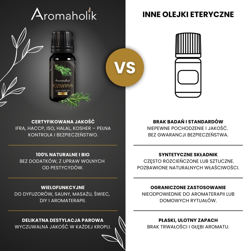 Olejki Aromaholik są pozyskiwane z naturalnych składników* drogą destylacji starannie wyselekcjonowanych wierzchołków kwiatowych Rozmarynu z Indii – a nie drogą syntetyczną, jak większość olejków zapachowych. Posiadają wysoką koncentrację (50% większa niż standardowy olejek) oraz są w pełni rozpuszczalne w wodzie.