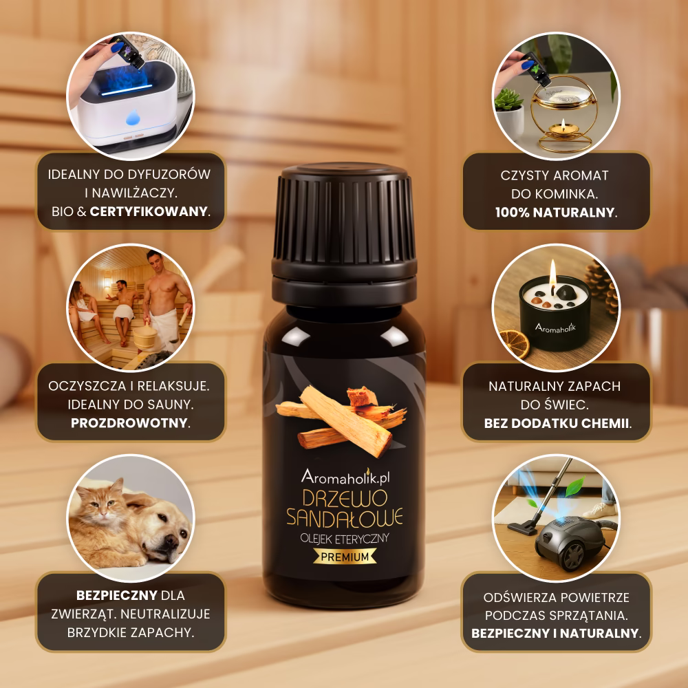 Olejek z Drzewa Sandałowego to produkt niezwykle wszechstronny – możesz stosować go w różnych formach, dopasowując do swoich potrzeb. Świetnie sprawdzi się w nawilżaczu powietrza, dyfuzorze lub kominku zapachowym, tworząc przytulną atmosferę i wprowadzając wyjątkowy zapach. Można dodać go do świec, wosków zapachowych, sprayów do pomieszczeń czy zawieszek (np. do szafy lub auta). Olejek z Drzewa Sandałowego świetnie sprawdza się w saunie lub przy codziennych obowiązkach – do prania czy odkurzacza. To prosty sposób na naturalne odświeżenie swojej przestrzeni.