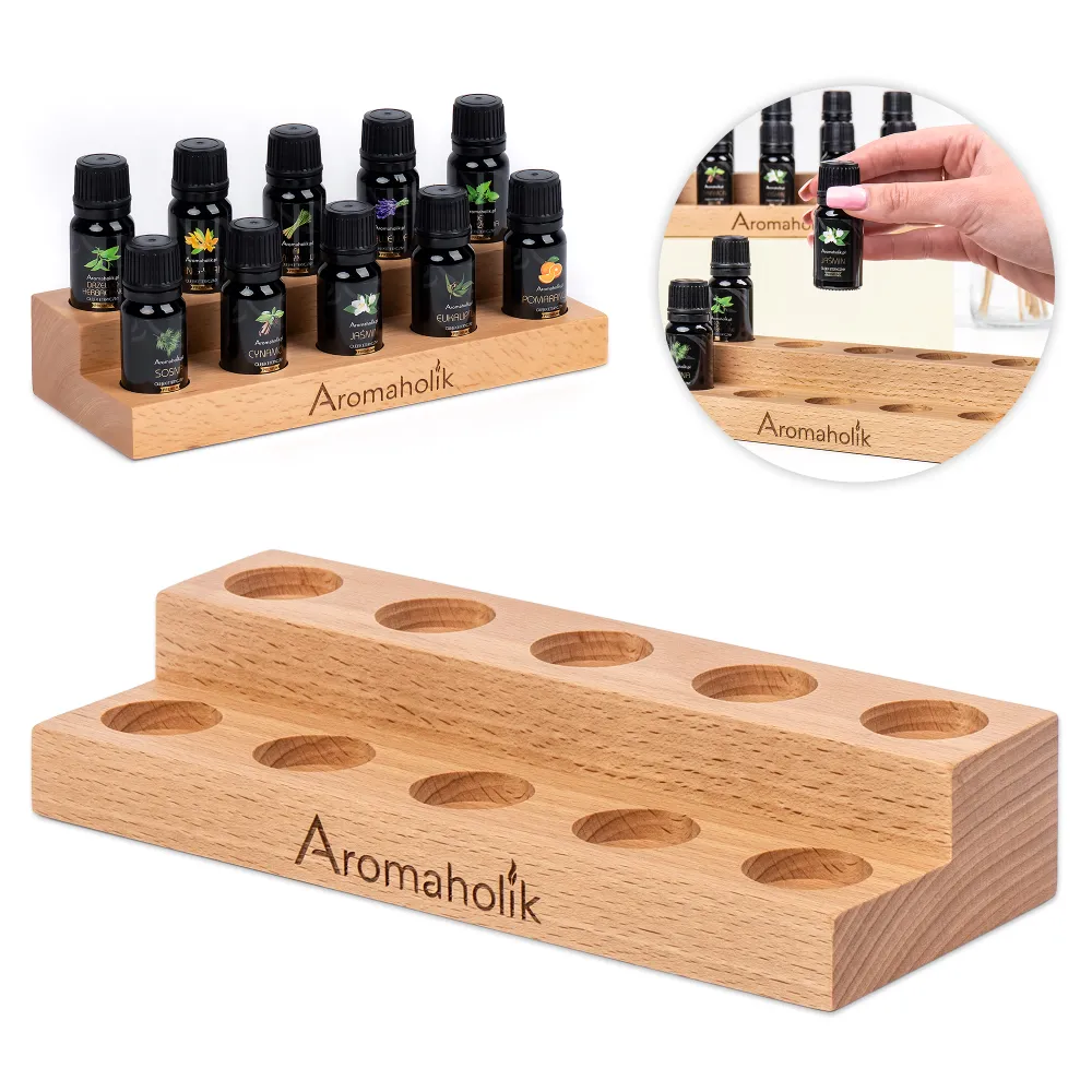 Drewniana podstawka to świetny element każdego wnętrza. Doskonała do wykorzystania w domowym zaciszu, ale także jako ozdoba do salonu masażu, gabinetu aromaterapii czy sklepu z naturalnymi produktami — wszędzie tam, gdzie liczy się styl. Ekspozytor na olejki eteryczne został zaprojektowany tak, by idealnie eksponować produkty znajdujące się na nim, podkreślając ich wyjątkowy charakter.