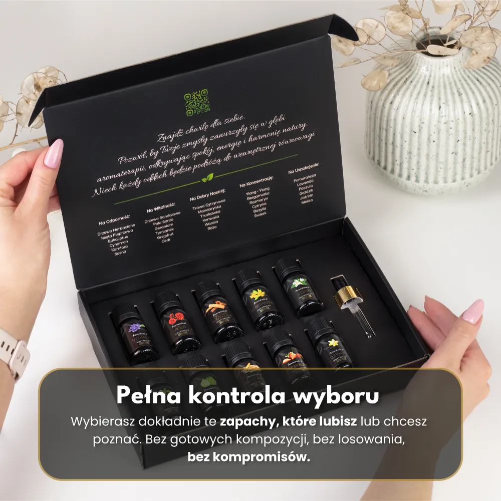 Żadnych przypadkowych zapachów. Żadnych olejków, które będą stać nieużywane na półce. Każdy produkt w Twoim zestawie to świadomy wybór – dokładnie to, czego potrzebujesz.