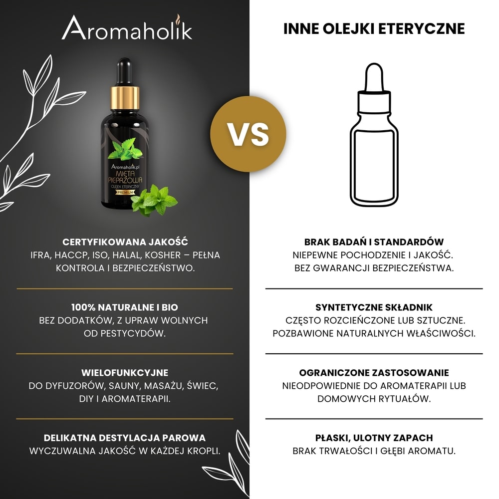 W połączeniu z naturalnym olejkiem miętowym, zestaw tworzy potężną alternatywę dla syntetycznych koncentratów. Olejek wzbogaca aromat o głębokie, roślinne tony, podczas gdy kryształy odpowiadają za przenikliwe uderzenie chłodu. To duet stworzony dla osób, które cenią naturalny skład i poszukują autentycznych wrażeń zapachowych bez chemicznych dodatków.
